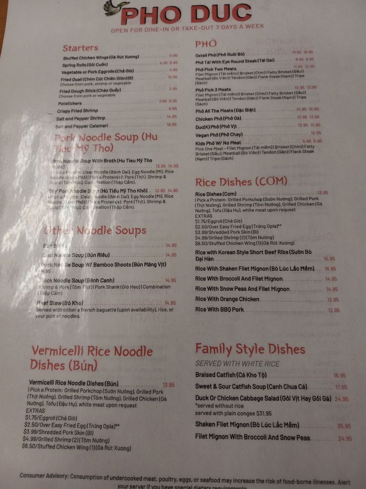 Pho Duc Midlo Menu